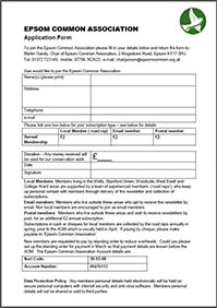 The annual membership subscription is £5.00 for members who live in the immediate vicinity of Epsom Common, or have their newsletters delivered by email. We normally deliver newsletters by hand to local members.